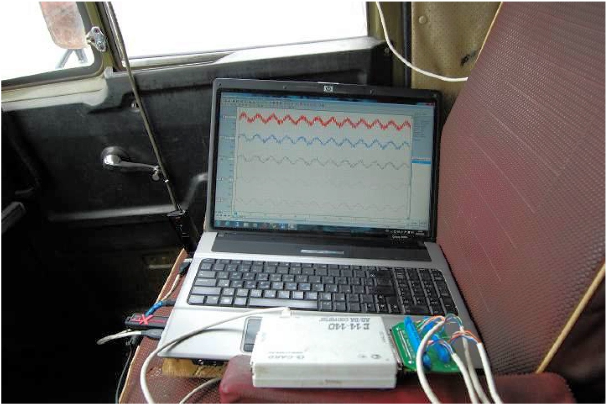 Для проведения экспериментальных исследований был создан комплекс оборудования, состоящий из ноутбука, АЦП E14‑140, акселерометров Freescale Semiconductor MMA7260QR2, датчика перемещения подвески WABCO № 441 050 100 0 (работает по принципу угла поворота), датчика угла поворота управляемых колес и датчика угла сборки звеньев автопоезда, функции которых выполняет датчик WABCO № 441 050 100 0.