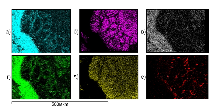 Рисунок 7. Распределение химических элементов в материале гофры компенсатора, образец № 1: а) содержание кислорода; б) содержание железа; в) содержание марганца; г) содержание хрома; д) содержание никеля; е) содержание титана.