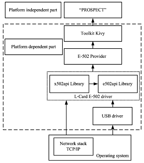 Рисунок 1. Кросс-платформенная архитектура программной составляющей линейного локатора на базе устройства сбора данных E‑502.
