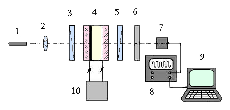 Рисунок 1. Схема измерения оптического пропускания и динамики электрооптического отклика ЖК ячеек: 1 – полупроводниковый лазерный диод, 2 – коллиматор, 3 – поляризатор, 4 – ЖК ячейка, 5 – анализатор, 6 – фильтры, 7 – фотодиод, 8 – осциллограф, 9 – компьютер, 10 – крейтовая система LTR с модулем ЦАП LTR34.