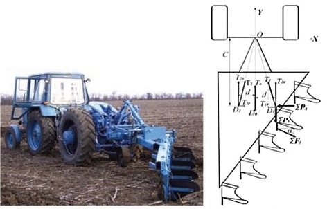 Проведённые эксперименты позволяют утверждать, что колебания глубины вспашки агрегата на базе обычного двухосного трактора выше, чем у пахотного агрегата на базе трехосного МТУ. Для объяснения этого результата авторы проанализировали конструктивные схемы пахотных агрегатов в продольной вертикальной плоскости (рисунок 2).