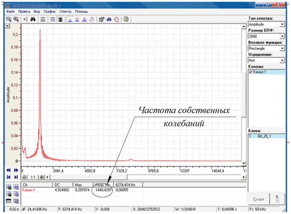Экспериментальное определение частоты собственных колебаний (ЧСК) упругой системы деталей проводили по осциллограмме затухающих колебаний, которые вызывались методом ударного возбуждения стальным шариком, подвешенным на тонкой нити (рисунок 2). Виброперемещение упругого элемента регистрировалось бесконтактным токовихревым датчиком, входящим в комплект виброметра ВВВ‑302. Далее аналоговый сигнал с виброметра преобразовывался АЦП E‑140 и записывался с помощью программы LGraph2. ЧСК определяли спектральным анализом осциллограммы затухающих колебаний методом быстрого преобразования Фурье (БПФ).