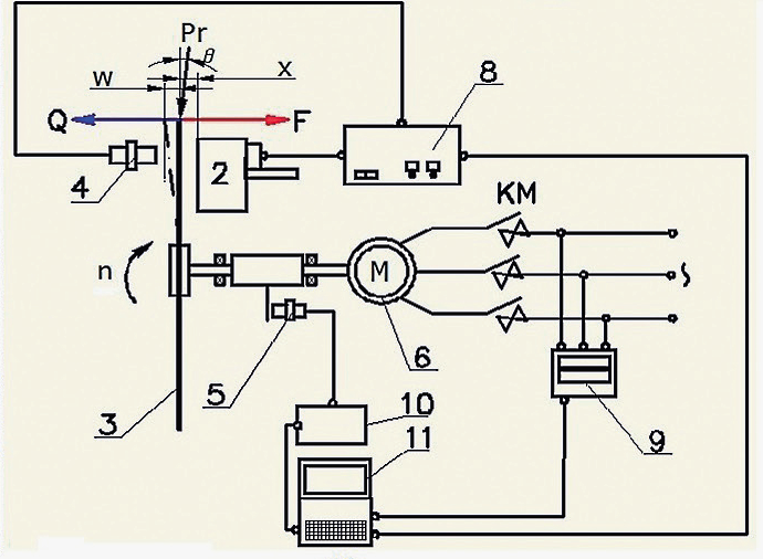 Отклонение пилы измеряется с помощью индуктивного датчика положения 4, установленного относительно полотна пилы 3 с противоположной стороны от электромагнита 2. Мощность, потребляемая электродвигателем, измеряется с помощью цифрового устройства для измерения мощности 9, включенного в сеть питания электродвигателя 6 установки. Частота вращения пилы измеряется с помощью индуктивного датчика скорости вращения 5. Сигнал с датчика вращения через устройство сбора данных 10 поступает на ЭВМ.