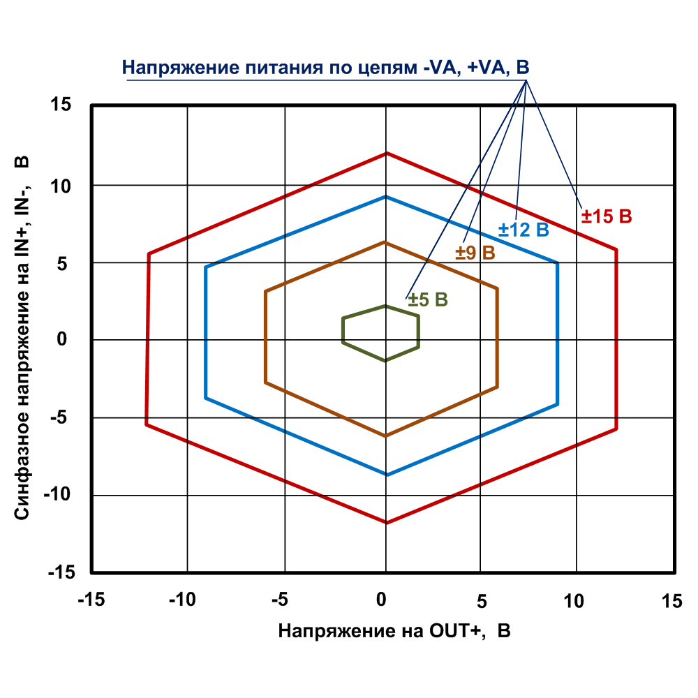Диапазон напряжения синфазного сигнала (UCM =0,5*(UIN++UIN-) От (U-VA +3,1) В до (U+VA -2,9) В